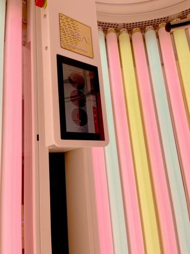 新しい120W の高性能で低消費のKALFASUN COLORTANランプとFULL ELECTRONICシステムを組み合わせることで、従来のバラストと最大 200W の高出力ランプを備えたソラリウム モデルと比較して、最大 70% の消費を節約できます。